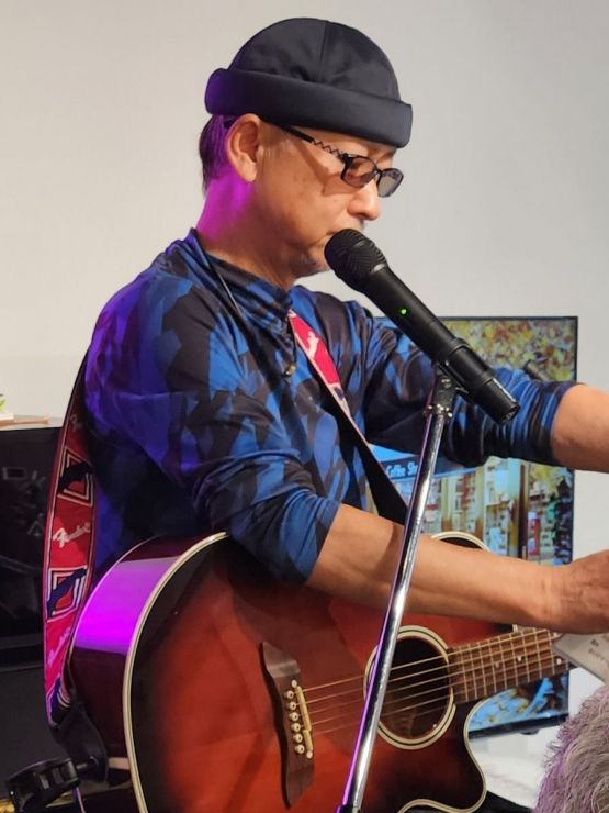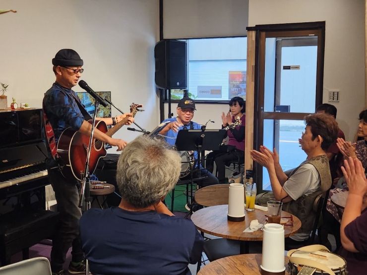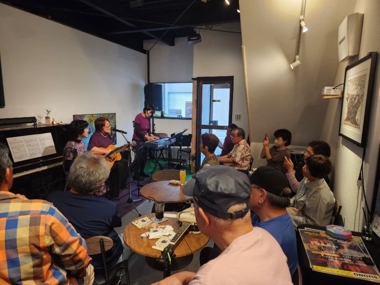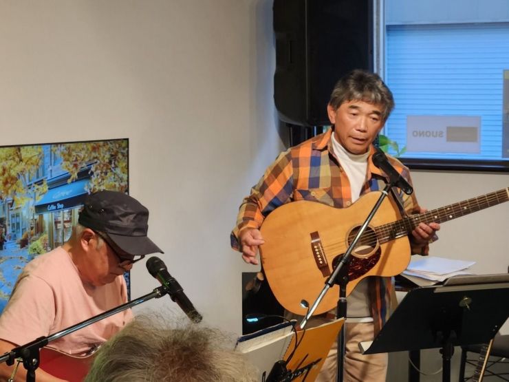 技の館のメンバーと水鏡のグループが「Cafe Studio SUONO」で共演、昭和歌謡・ポップス・フォークソング・カントリー等の歌お披露した