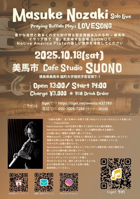 豊かな自然と数多くの文化財が残る歴史情緒あふれる町、美馬市、イタリア語で「音」意味する会場「SUONO」でNative American Fluteの優しい歌声が響き渡りました。